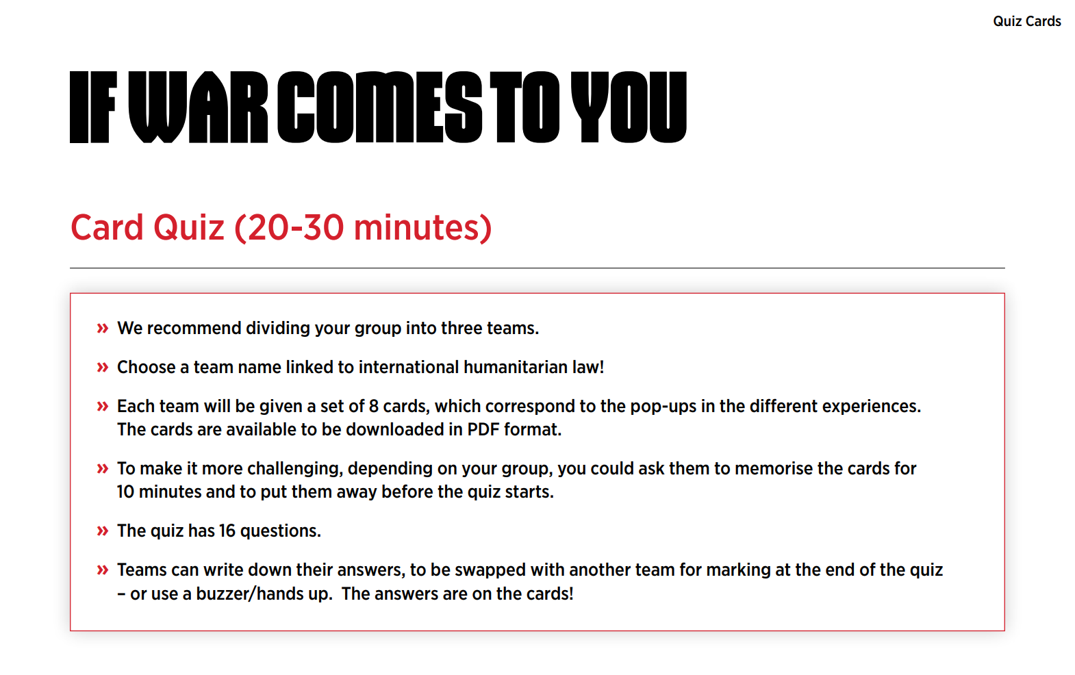 A Rules of IHL quiz based on the pop-ups seen throughout the film (20-30 minutes)