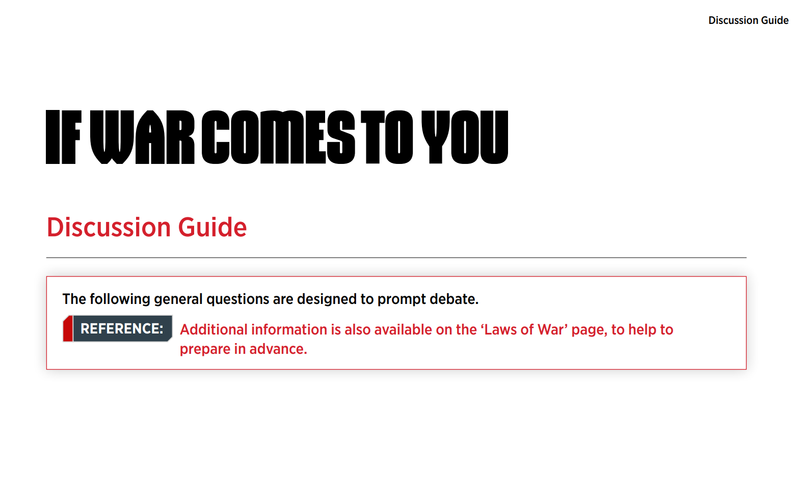 The Laws of War section includes scenes from the film paired with short, clear explanations of key IHL principles.